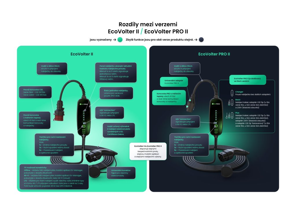 Nový EcoVolter & EcoVolter PRO druhé generace přináší širokou škálu možností. Ať už potřebujete jednoduché offline řešení, nebo profesionální fleetové řešení s LTE připojením a MID certifikovaným měřením pro fakturaci či přesné měření spotřeby. EcoVolter II & EcoVolter PRO II se plně přizpůsobí Vašim potřebám – vyberte si mezi variantami 11kW nebo 22kW. Pořiďte si klidně Offline verzi. Pokud v průběhu užívání zjistíte, že potřebujete připojení přes Wi-Fi, jednoduše přikoupíte konektivitu v naší mobilní aplikaci EV-Manager a můžete nadále používat stejný přenosný Wallbox a využívat mnohem více funkcí.