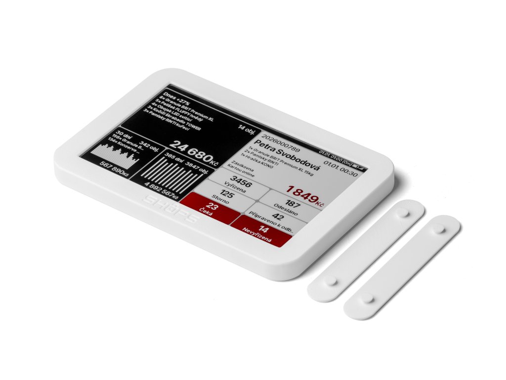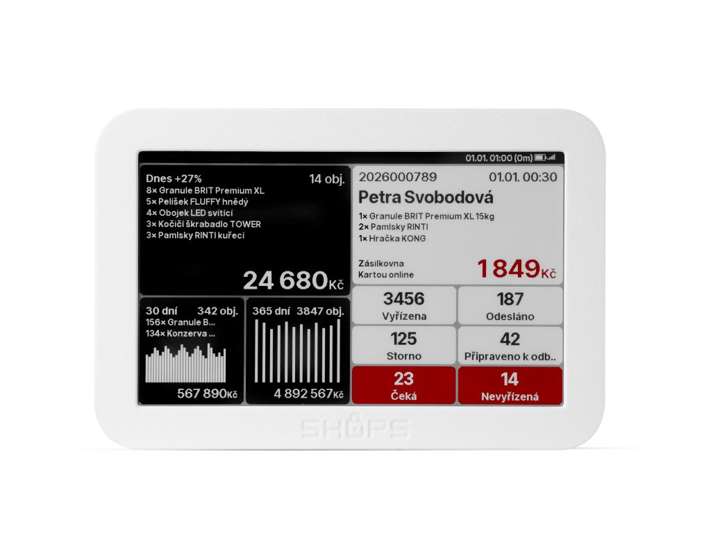 Proto vznikl SHOPS (aka SHOP STATION): samostatný e-ink displej, který vám dá přehled o objednávkách a tržbách na stole nebo na zdi. Bez otevírání administrace. Bez rozptylování. Jen tichý, čitelný dashboard – a červená vás upozorní, když je potřeba zpozornět.