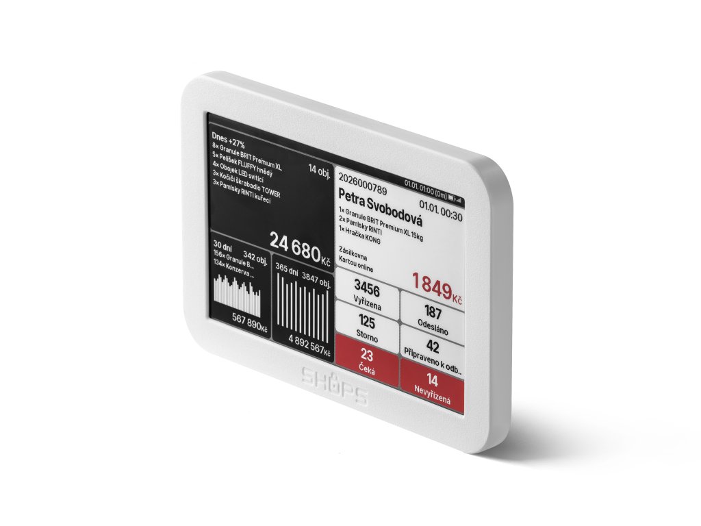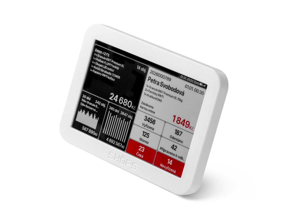 Mějte tržby a objednávky na očích – bez otevírání počítače. SHOPS je samostatný e-ink displej, který zobrazuje přehled vašeho Shoptet e-shopu: denní tržby, trend, top produkty, statistiky za 30 a 365 dní, poslední objednávku v detailu a stavy objednávek. Červená barva upozorní, když je potřeba zpozornět.